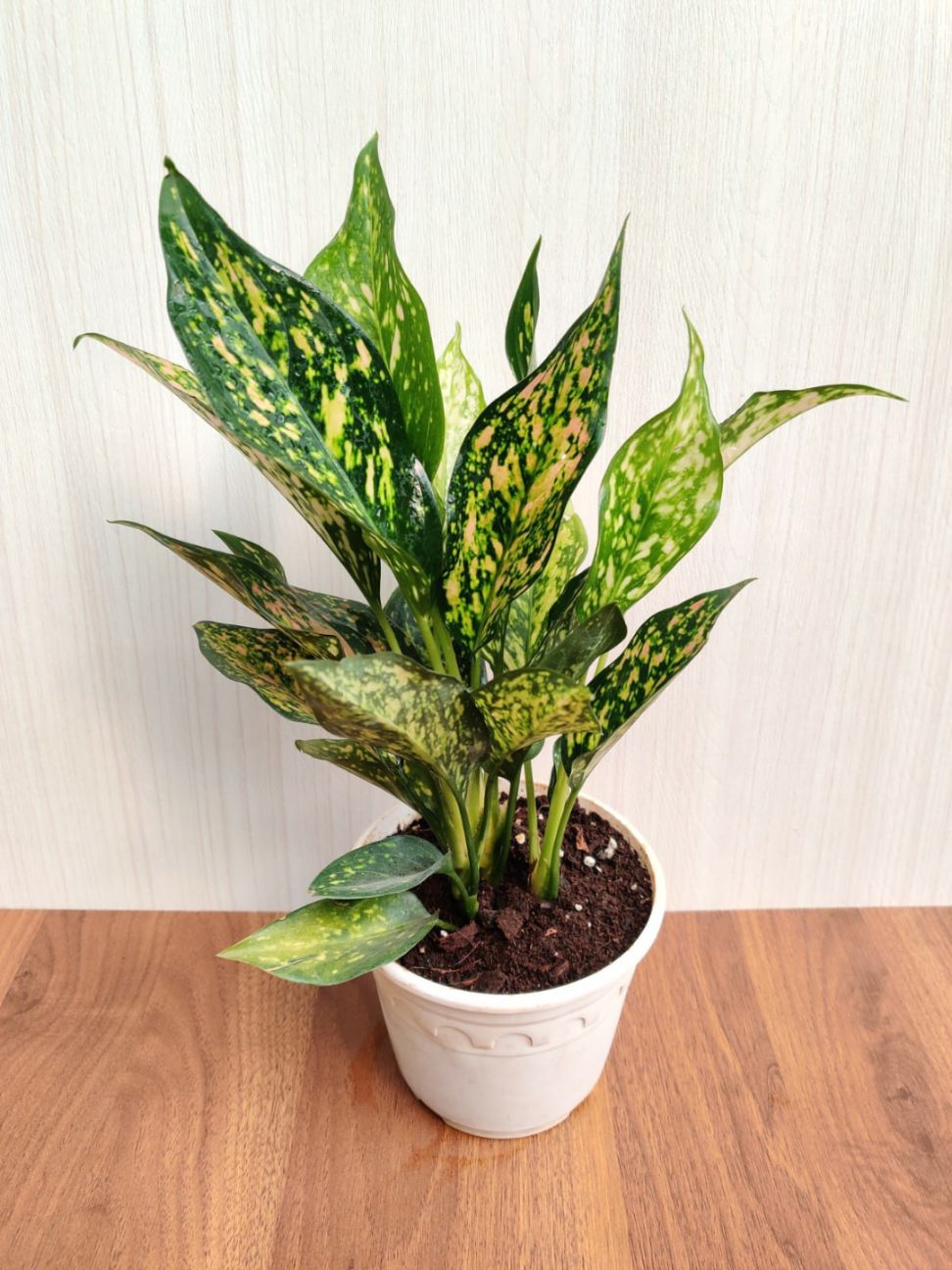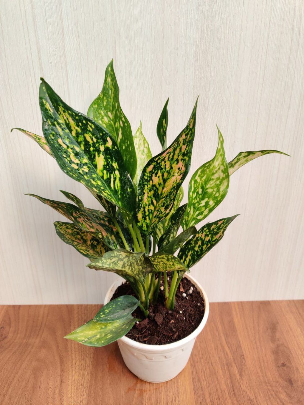 Aglaonema ‘Green Rosy’ features glossy, dark green leaves that are adorned with shades of pink or red. The pink or red coloration typically appears as veins, spots, or blotches on the leaves, creating a rosy or flushed appearance. The contrast between the green and pink/red hues gives the plant a vibrant and eye-catching look.
